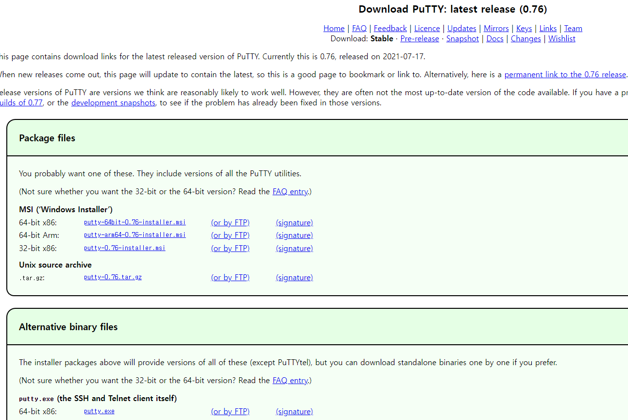 간만에 putty 홈페이지 가보니 21.07.17 에 릴리즈된 0.76버전이 있네요.
