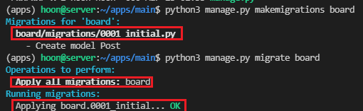3. python3 manage.py sqlmigrate board(앱이름) 0001.initial