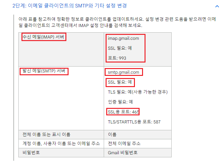 - 위 설정은 구글 IMAP / SMTP 가이드라인에 따른 설정입니다.