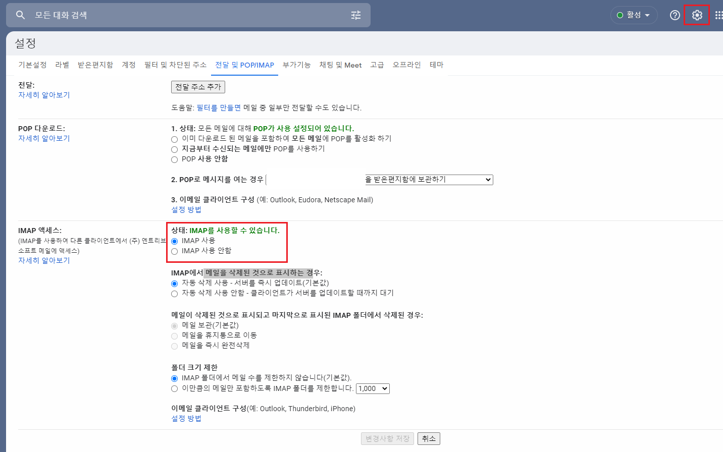 4-1. gmail 설정(톱니바퀴모양) 클릭 후 전달 및 POP/IMAP 탭에서 IMAP 액세스를 사용으로 변경 합니다.