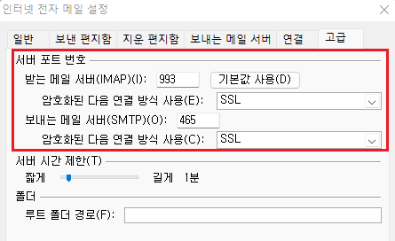 [고급] 탭에서 아래와 같이 포트 입력 및 SSL 설정 합니다.