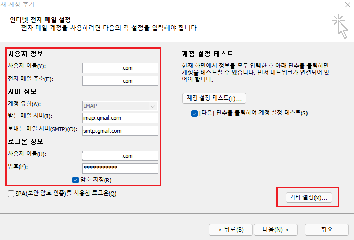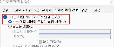 입력 후 [기타 설정]을 클릭하여 [보내는 메일 서버 탭]에서 아래와 같이 체크