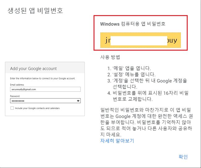 - 영문으로 생성된 앱 비밀번호를 복사하거나 메모장에 붙여넣습니다.