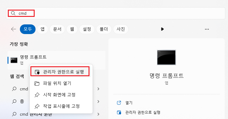 - cmd 관리자 권한 실행