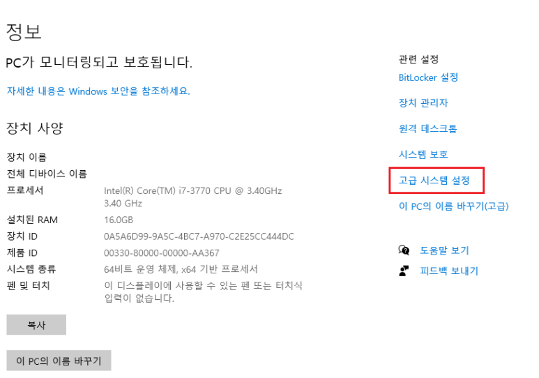 내PC > 속성 혹은 윈도우키를 눌러 변수라고 입력하시면 "시스템 환경 변수 편집" 클릭하시면 됩니다.