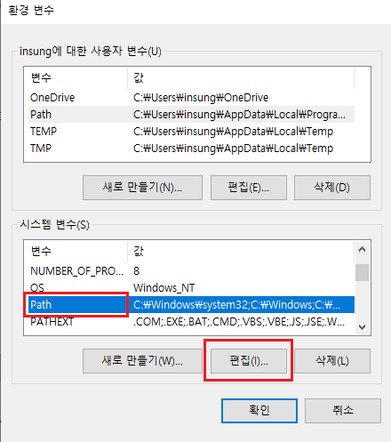 사용자에 대한 사용자 변수에는 설치시 add path를 했기 때문에 설정이 되어있을 겁니다.